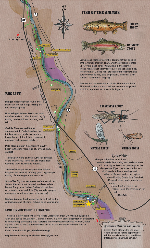 A detailed map design for our local Trout Unlimited chapter showcasing the town stretch of the Animas River. For a printable pocket map
