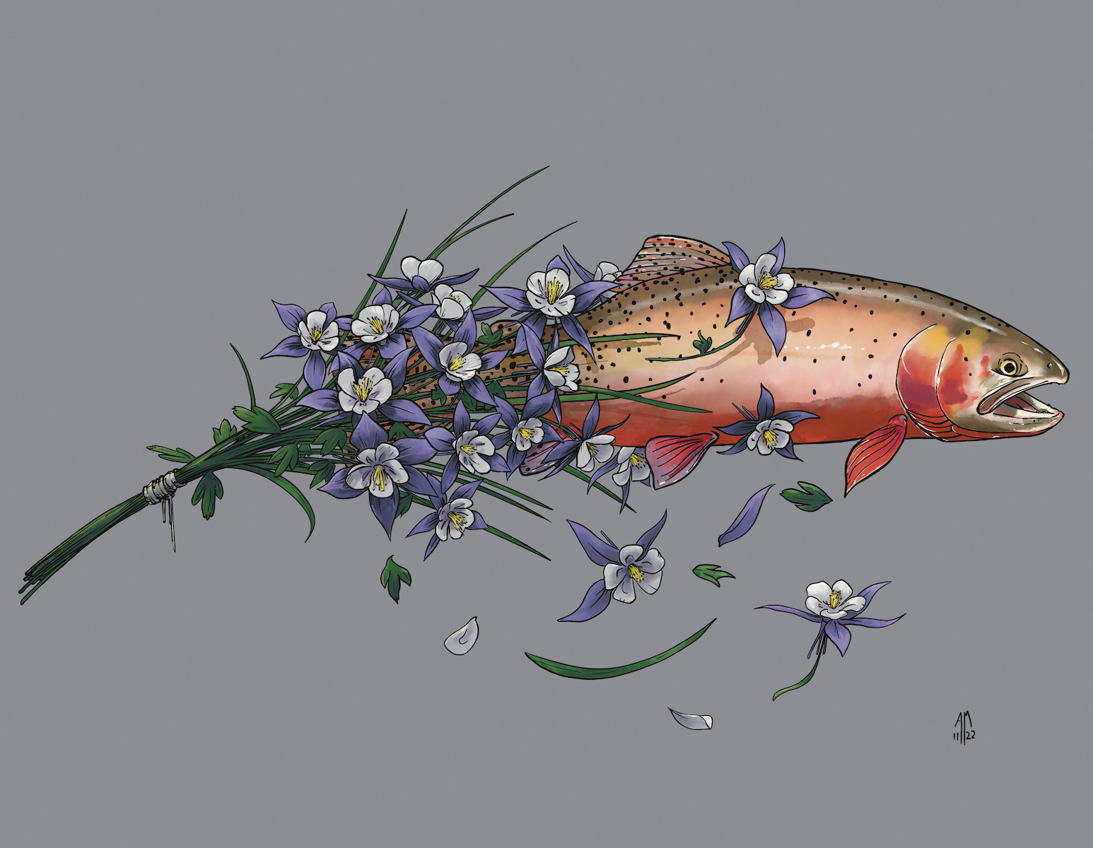 Within the heights of the west, throughout the summer, one can find an abundance of columbine flowers in the meadows and cutthroat trout in the creeks and lakes. This is my bouquet celebrating both, for those who have found these gems in the western mountains. Painted for an artist feature in Trout Unlimited's national publication, Trout Magazine.