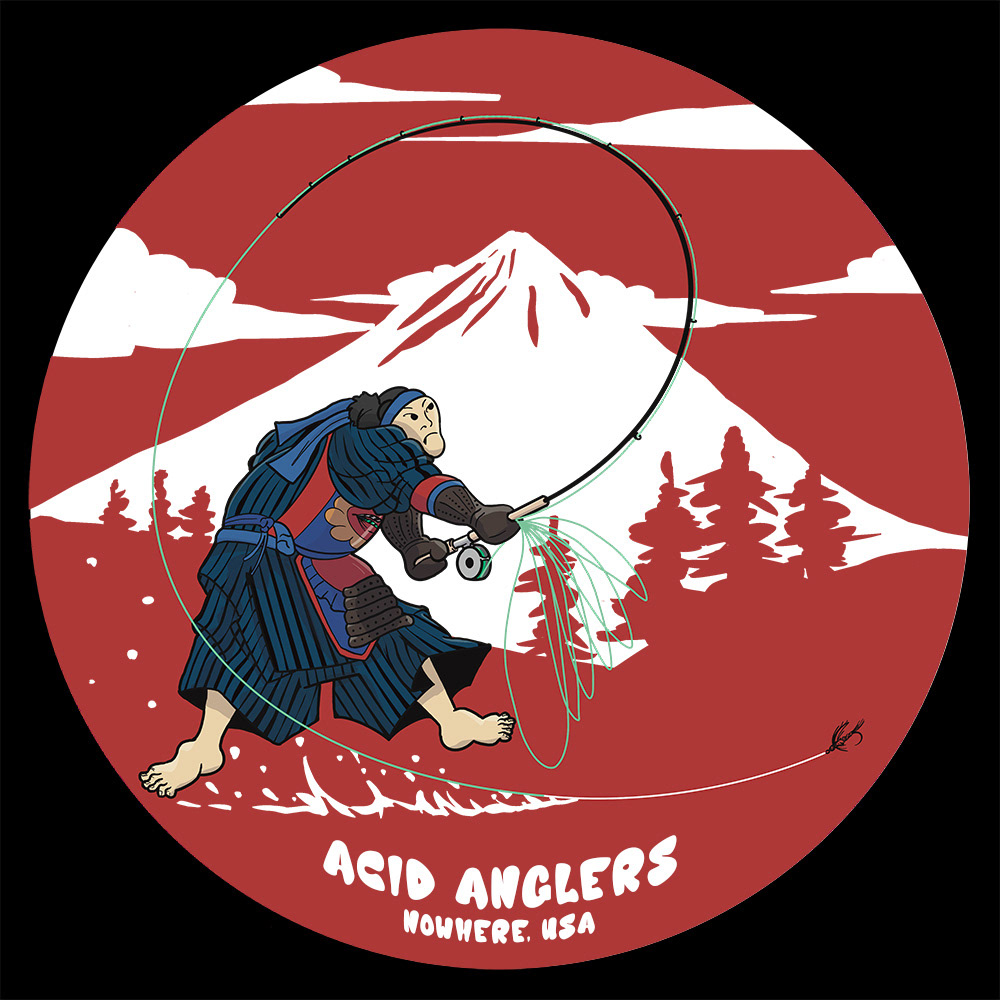 Interestingly enough, wielding a samurai sword and casting a Spey fly fishing rod both have a similar two-handed motion that maximizes effectiveness with minimum force exertion. Hence, this Kendo/fly fishing crossover design for Acid Anglers.